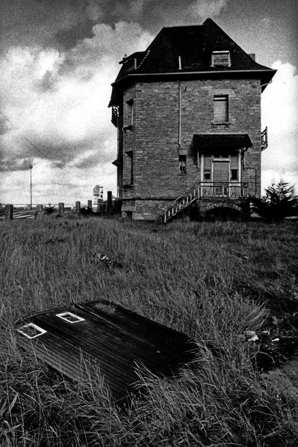 On y voyait en premier plan, gisant dans l’herbe, sur la gauche, trois vantaux d’une porte de garage, dont deux avaient encore leur oculus de plastique. Au fond, décentré sur la droite et vu en contre-plongée, le pignon droit d’une haute villa abandonnée en pierre de taille, aux ouvertures murées. Un escalier d’une dizaine de marches montait jusqu’à un petit perron surmonté d’un auvent.